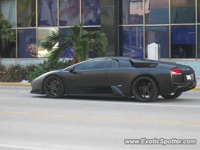Beautiful all matte black Murcielago Roadster driving along Lincoln Road in South Beach.