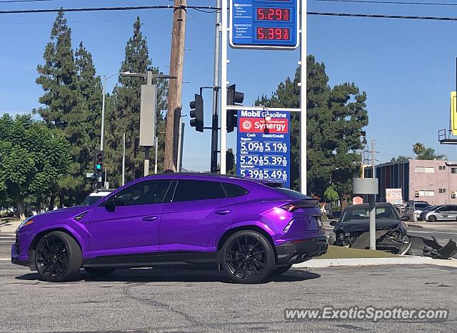 Purple Urus, high gas prices, and a car accident in the same photo.